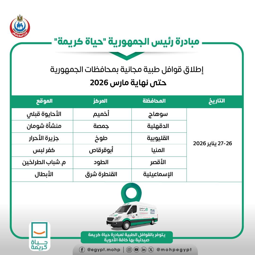 أعلنت وزارة الصحة والسكان، عن إطلاق قوافل طبية مجانية بمحافظات الجمهورية حتى نهاية مارس ٢٠٢٦ ضمن مبادرة حياة كريمة.
