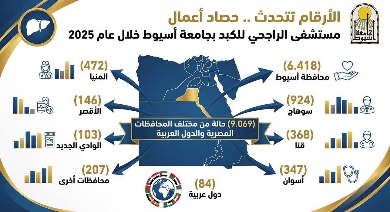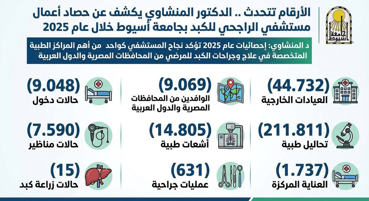 631 جراحة ناجحة و15 زراعة كبد بمستشفى الراجحي بجامعة أسيوط 2025 «إنفوجراف»