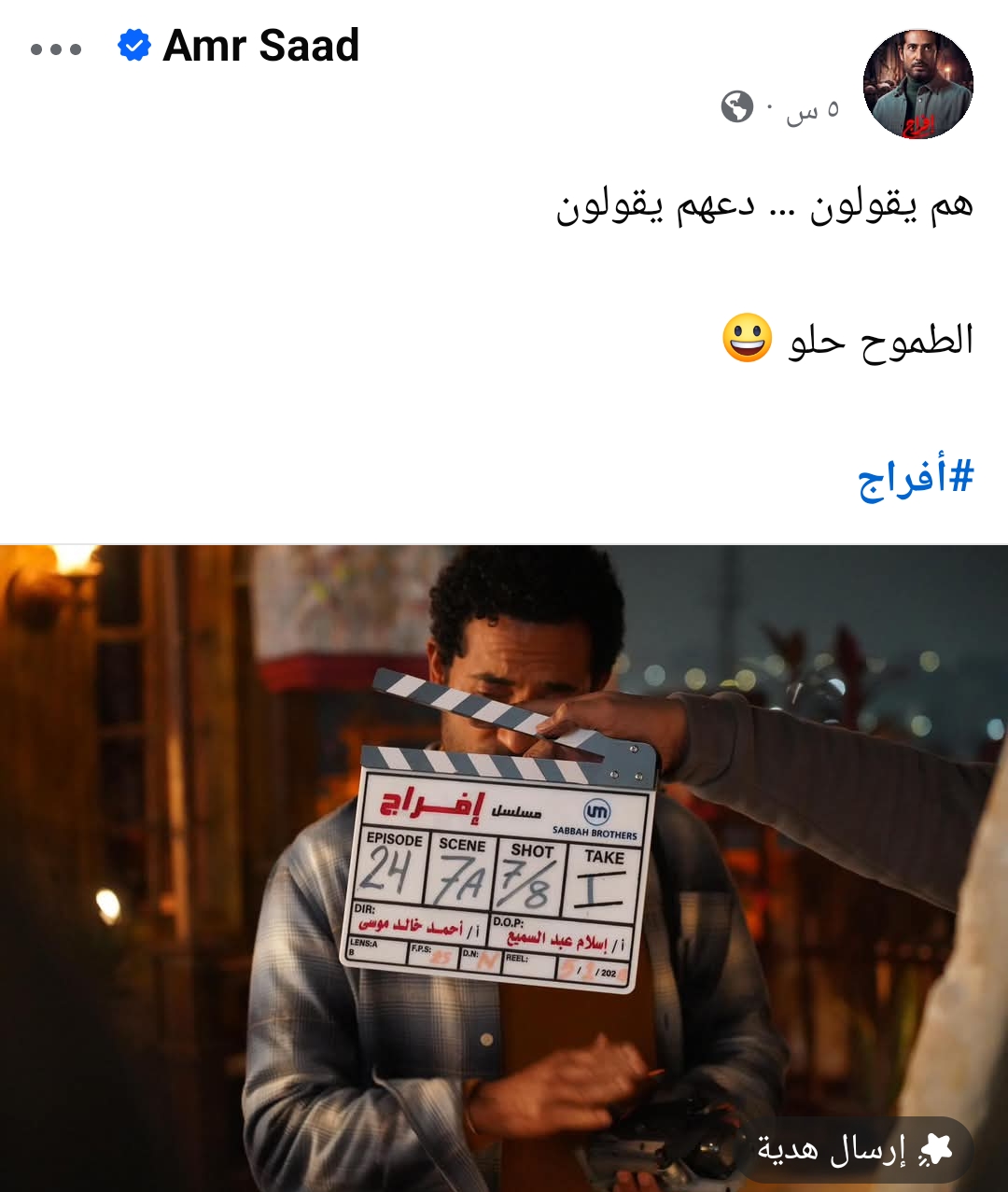 ونشر عمرو سعد، صورته من كواليس تصوير مسلسل إفراج، عبر حسابه الشخصي بموقع التواصل الاجتماعي فيسبوك، وعلق عليها قائلا: “هم يقولون دعهم يقولون.. الطموح حلو”.