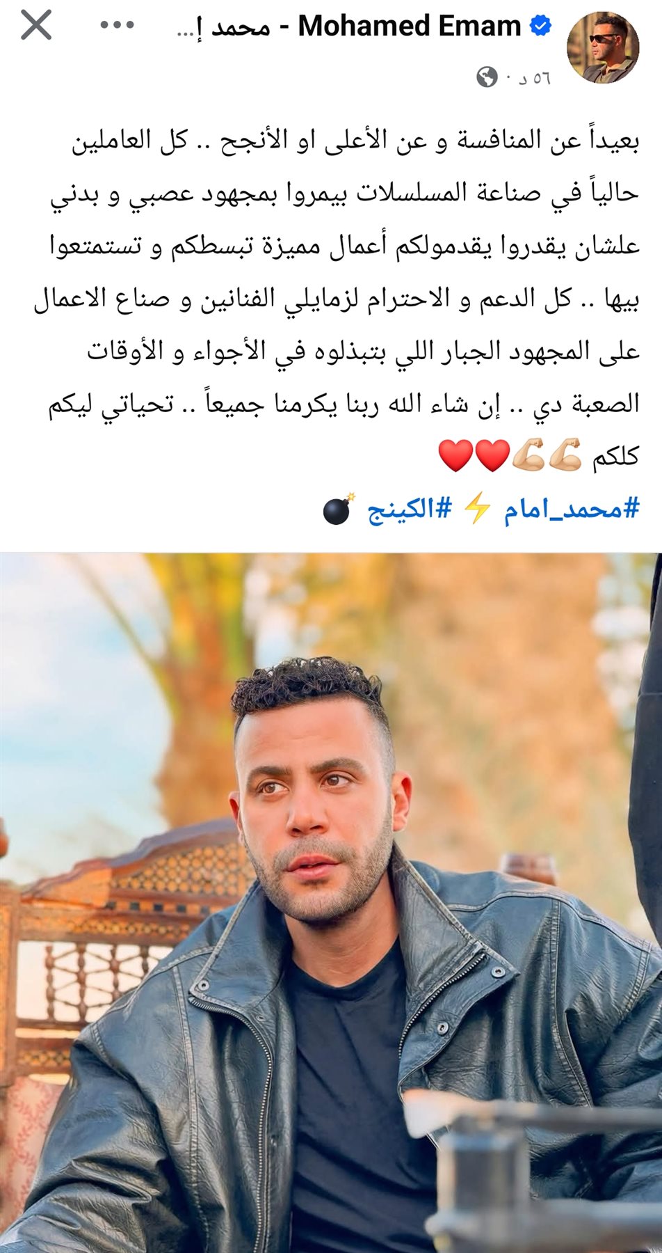 وكتب محمد إمام، عبر حسابه الشخصي بموقع التواصل الاجتماعي فيسبوك: “بعيدًا عن المنافسة وعن الأعلى أو الأنجح.. كل العاملين حاليًا في صناعة المسلسلات بيمروا بمجهود عصبي وبدني علشان يقدروا يقدمولكم أعمال مميزة تبسطكم وتستمتعوا بيها”.
