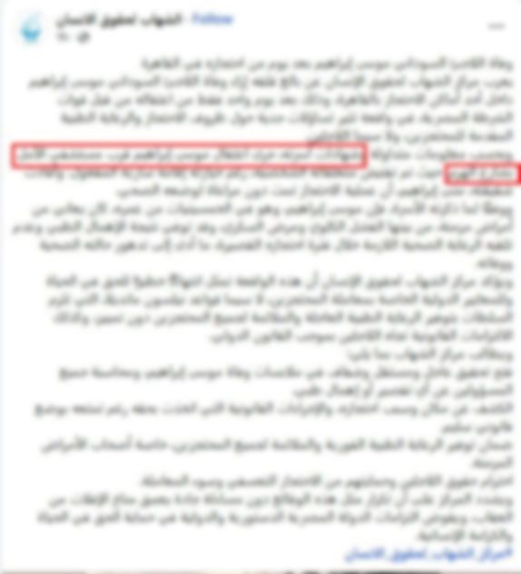 وقالت وزارة الداخلية في بيان لها إن مصدرًا أمنيًلا نفى جملةً وتفصيلًا صحة مقطع فيديو تم تداوله على عدد من الصفحات التابعة لجماعة الإخوان الإرهابية بمواقع التواصل الاجتماعي تضمن الزعم بقيام الأجهزة الأمنية بإلقاء القبض على (أحد الأشخاص يدعى موسى إبراهيم - " سودانى الجنسية") بنطاق بمحافظة الجيزة ووفاته بمحبسه.