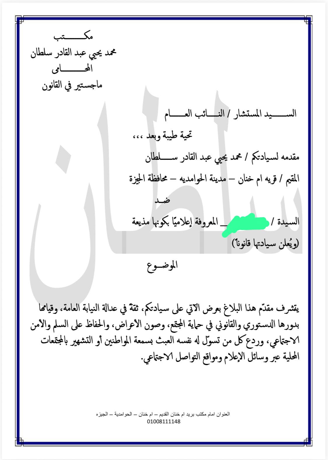 أعلن المحامي محمد يحيي سلطان، أحد أبناء مدينة الحوامدية شمال محافظة الجيزة، عزمه اتخاذ كافة الإجراءات القانونية اللازمة، والتقدّم بشكوى رسمية إلى السيد المستشار النائب العام، وذلك على خلفية تصريحات وصفها بالمسيئة والخطيرة صدرت عن إحدى المذيعات عبر وسائل الإعلام ومواقع التواصل الاجتماعي.