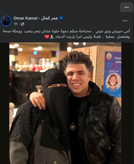 وكتب عمر كمال في منشوره: "أمي حبيبتي ونور عيني محتاجة منكم دعوة حلوة عشان بتمر بتعب ووعكة صحية وهتعمل عملية، فضلًا وليس أمرًا ياريت الدعاء".