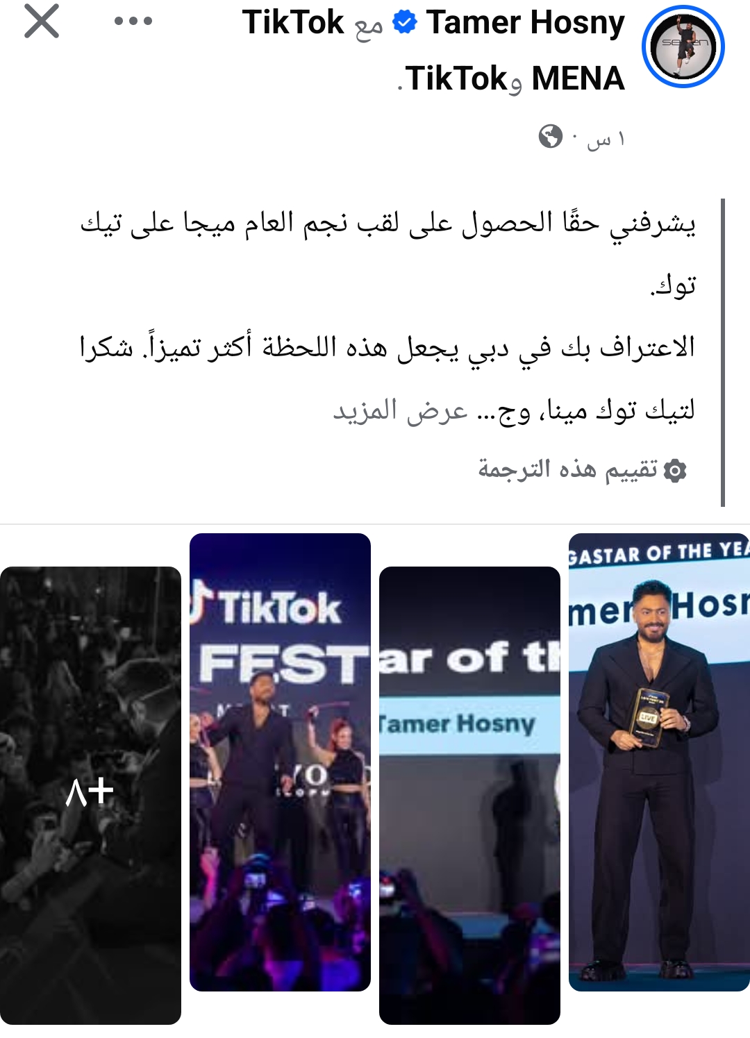 وعلق قائلا: “يشرفني حقًا الحصول على لقب نجم العام ميجا على تيك توك، الاعتراف بك في دبي يجعل هذه اللحظة أكثر تميزًا، شكرا لتيك توك مينا، وجميع معجبي هذا لنا جميعًا”.