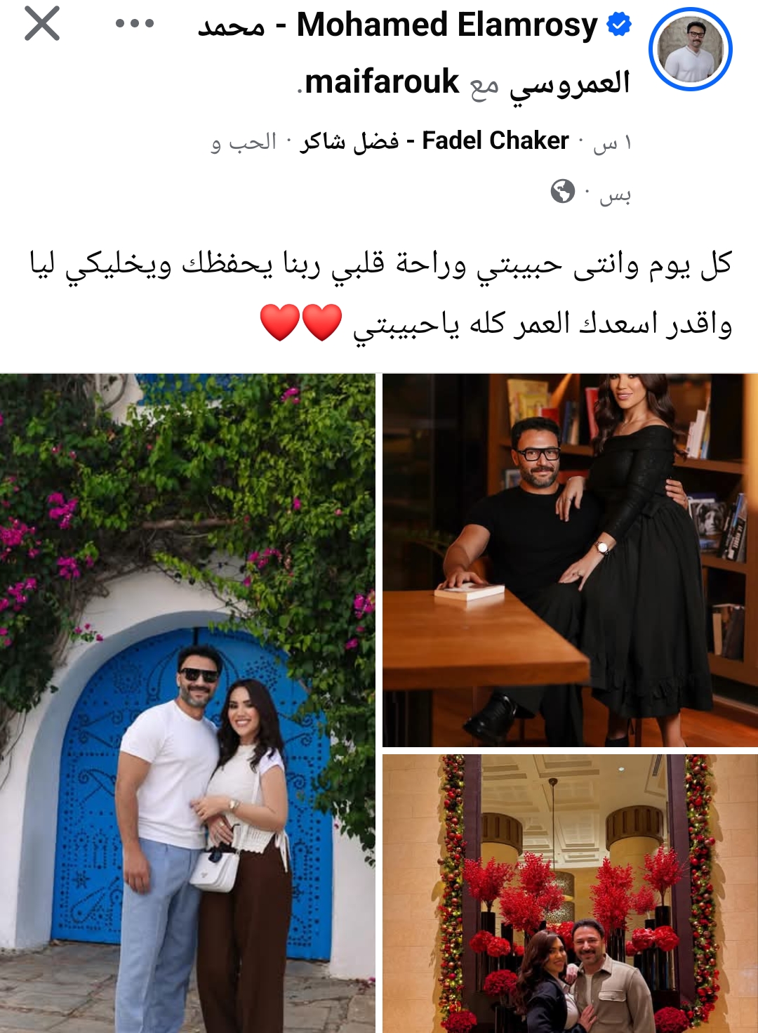 ونشر محمد العمروسي، مجموعة. صور تجمعه بزوجته مي فاروق، ووضع عليها أغنية للنجم فضل شاكر، عبر حسابه الشخصي بموقع التواصل الاجتماعي فيسبوك.