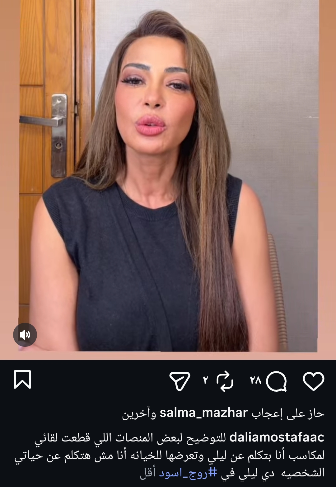 ونشرت داليا مصطفى، مقطع فيديو لها حتى تكشف من خلاله الحقيقة، وذلك عبر حسابها الشخصي بموقع تبادل الصور والفيديوهات الشهير إنستجرام، وعلقت قائلة: “للتوضيح لبعض المنصات إللي قطعت لقائي لمكاسب أنا بتكلم عن ليلى وتعرضها للخيانة في روج أسود، أنا مش هتكلم عن حياتي الشخصية دي ليلى”.