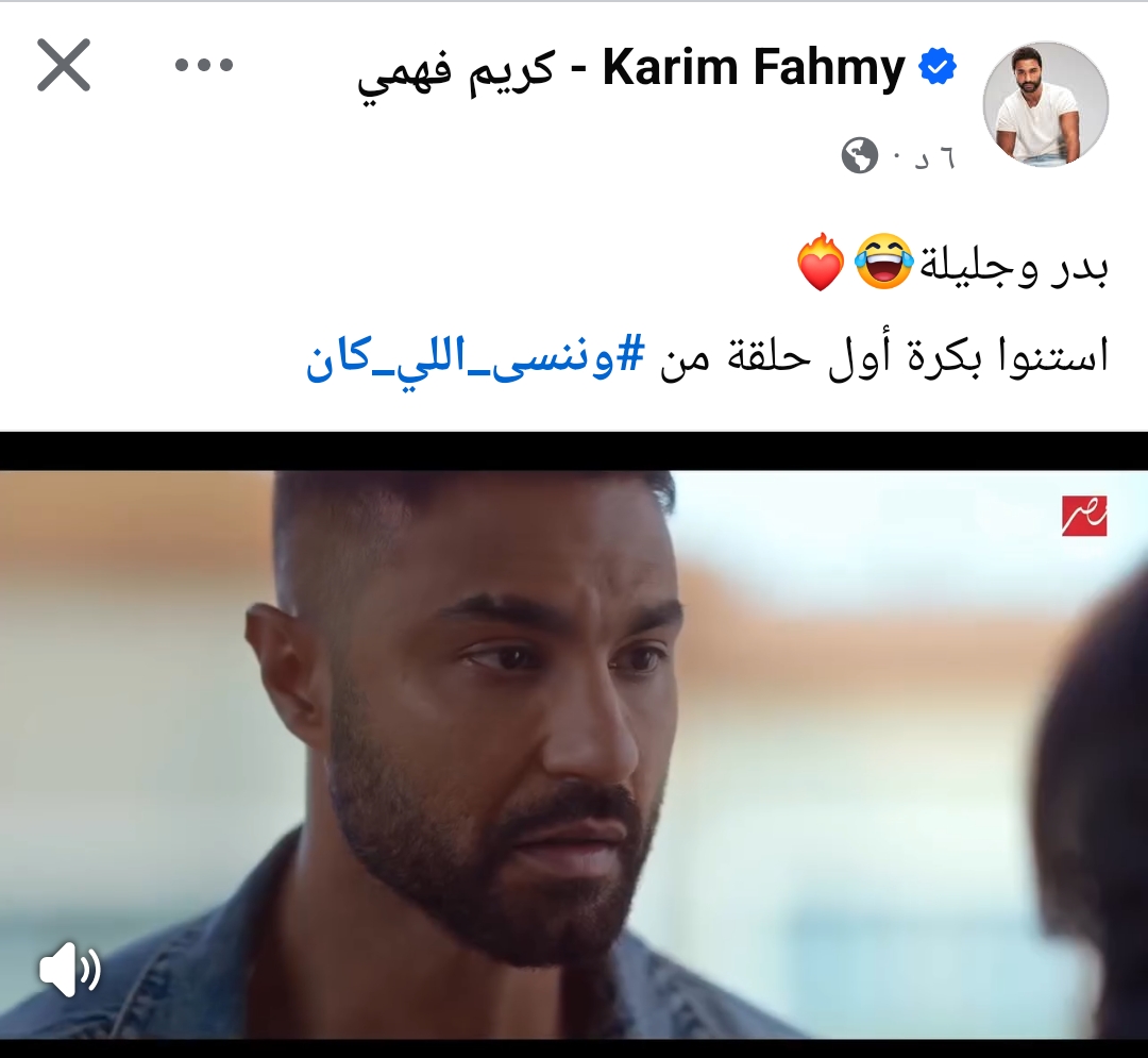 روج النجم كريم فهمي، للحلقة الأولى من مسلسل وننسى اللي كان، الذي يشارك فيه مع النجمة ياسمين عبد العزيز، والمقرر عرضه الحلقة الأولى، غدا على قناة mbc مصر.