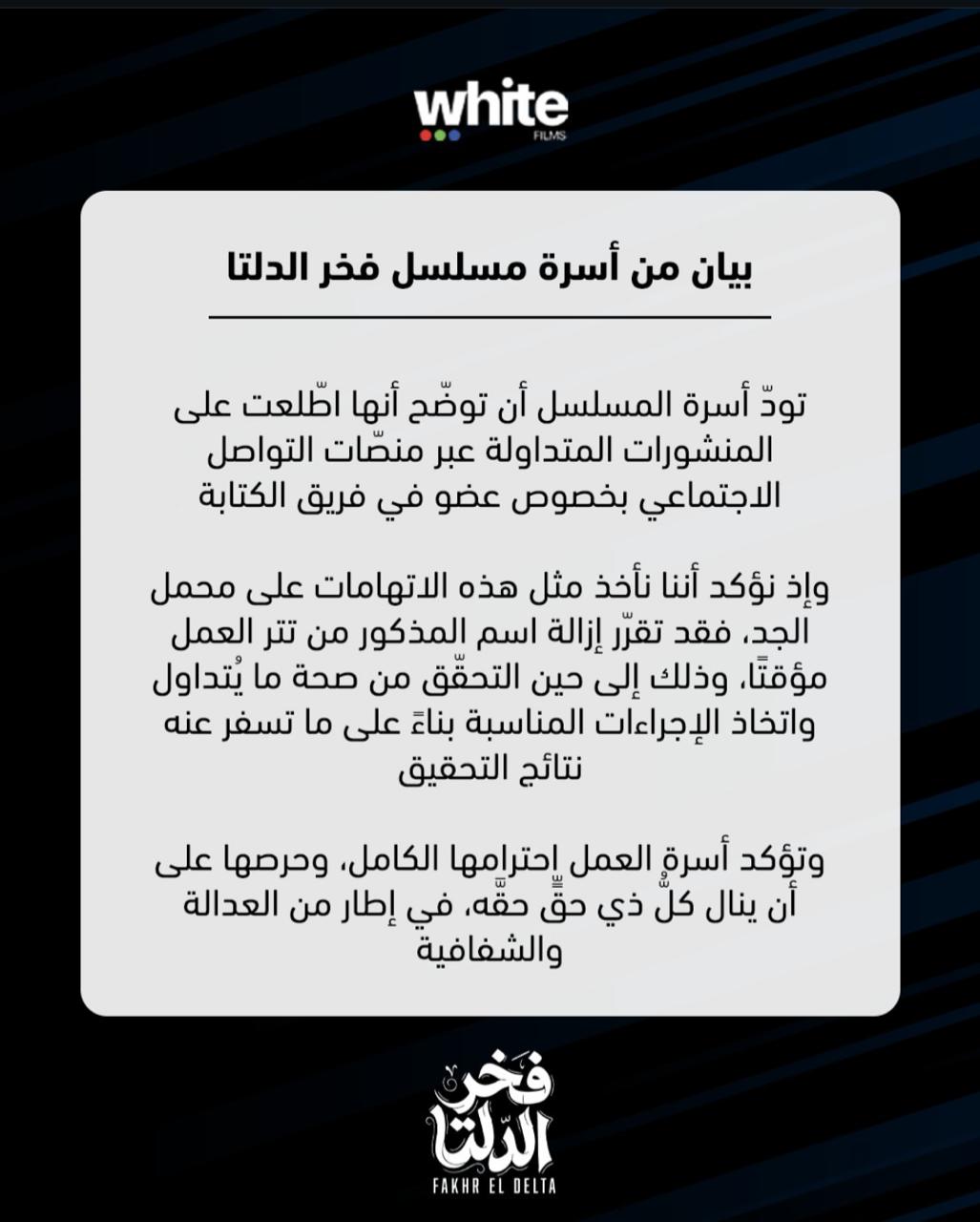 وأصدرت أسرة العمل بيانًا، أكدت فيه أنها تابعت ما يتم تداوله باهتمام بالغ، مشددة على أن مثل هذه الأمور يتم التعامل معها بمنتهى الجدية والمسئولية.