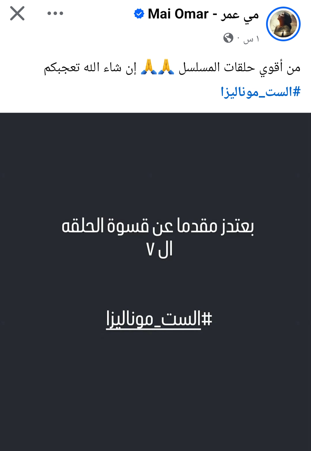 ونشرت مي عمر، عبر حسابها الشخصي بموقع التواصل الاجتماعي فيسبوك، منشورات كتبت فيه: “باعتذر مُقدما عن قسوة الحلقة 7، مسلسل الست موناليزا”