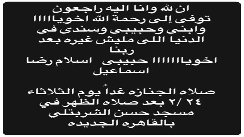 وتابع: «صلاة الجنازة اليوم الثلاثاء، بعد صلاة الظهر في مسجد حسن الشربتلي بالقاهرة الجديدة»».