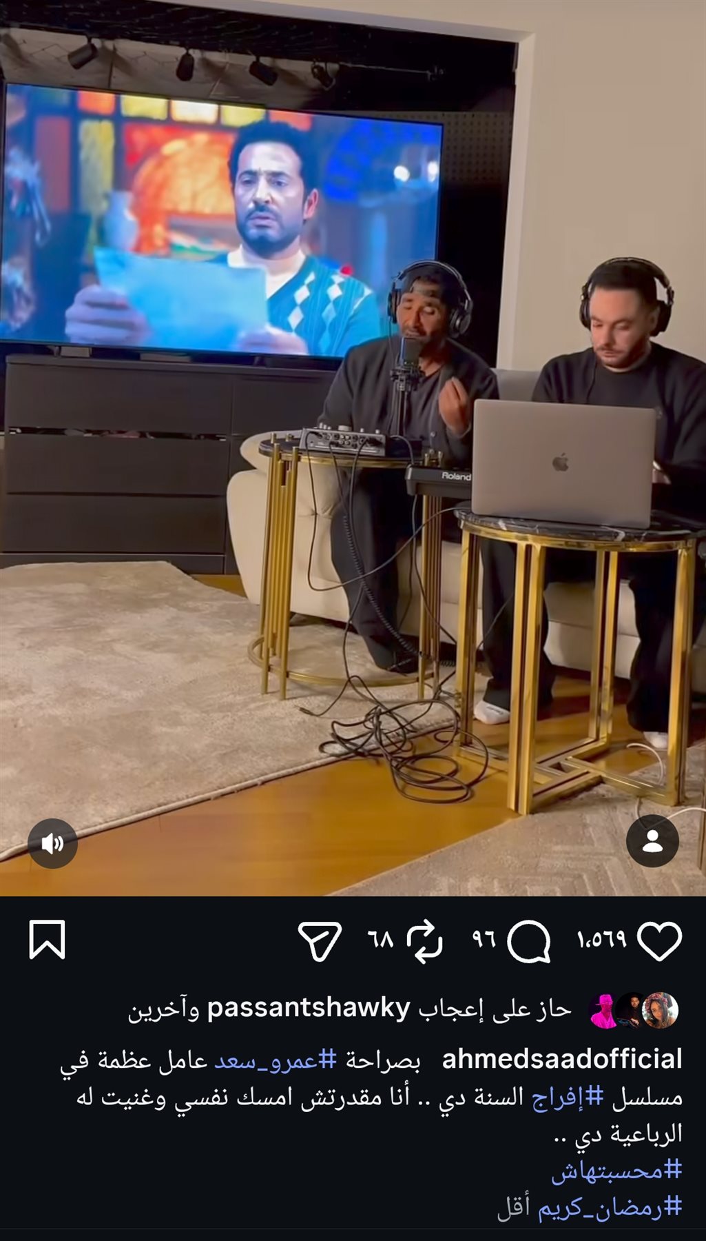وعلق على الفيديو قائلًا: "بصراحة عمرو سعد عامل عظمة في مسلسل إفراج السنة دي.. أنا مقدرتش أمسك نفسي وغنيت له الرباعية دي".
