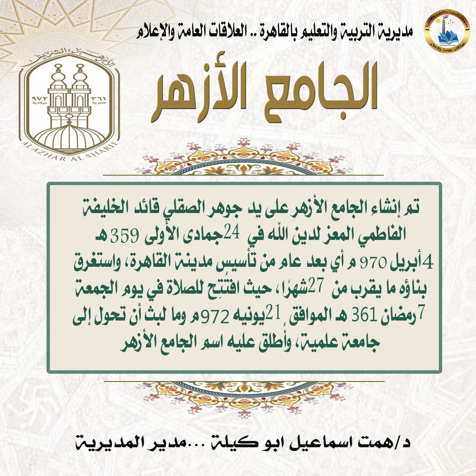 تعليم القاهرة يحتفل بمرور 1086 عامًا على تأسيس الأزهر الشريف "النور الذي لا يخبو"