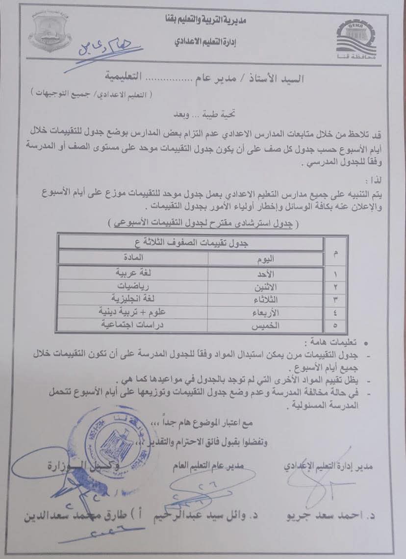 وأشارت تعليم قنا، إلى أنه في حالة وجود ما يتعارض مع ذلك الجدول في احدى المدارس الثانوية يتم اخطار الادارة التعليمية بخطاب معتمد التوجيه الفني المختص - قسم التعليم الثانوى - قسم المتابعة بالتعديل واخطار المديرية بذلك.