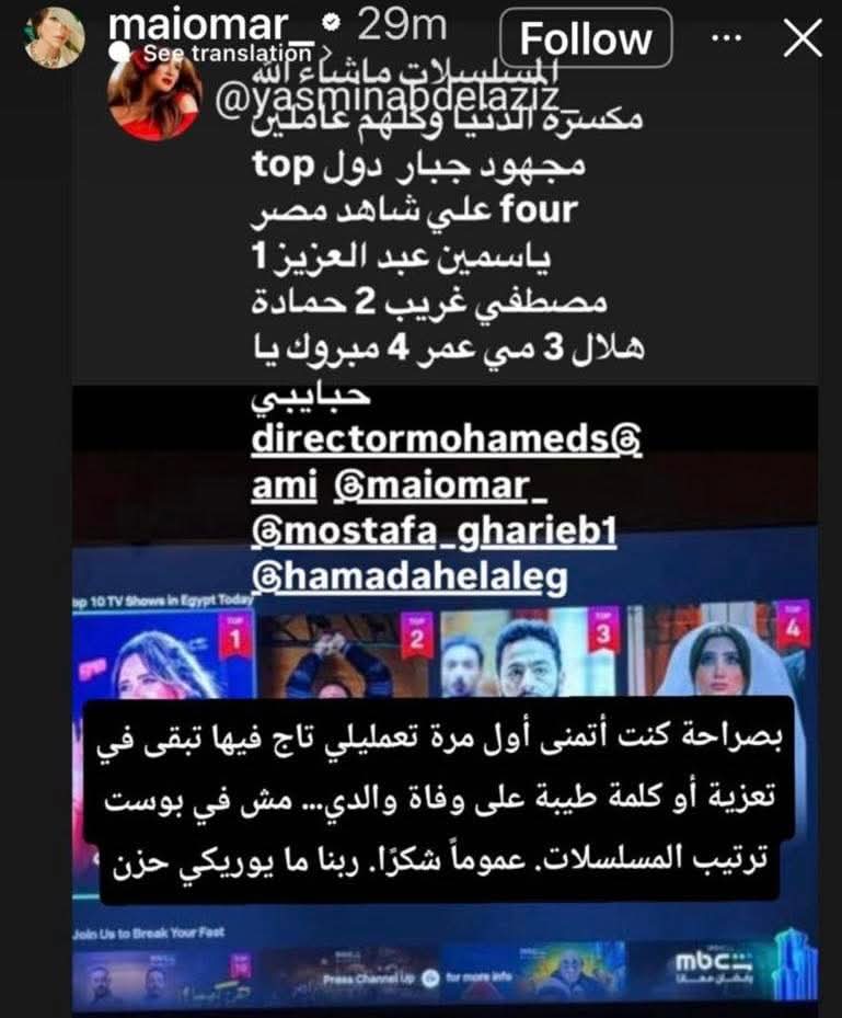 وكتبت مي عمر في منشور عبر خاصية ستوري حسابها الشخصي على موقع تبادل الصور والفيديوهات الشهير إنستجرام: “كنت أتمنى أول مرة تعمليلي تاج فيها، تبقى في تعزية أو كلمة طيبة على وفاة والدي، مش في بوست ترتيب المسلسلات.. ربنا ما يوريكي حزن”.