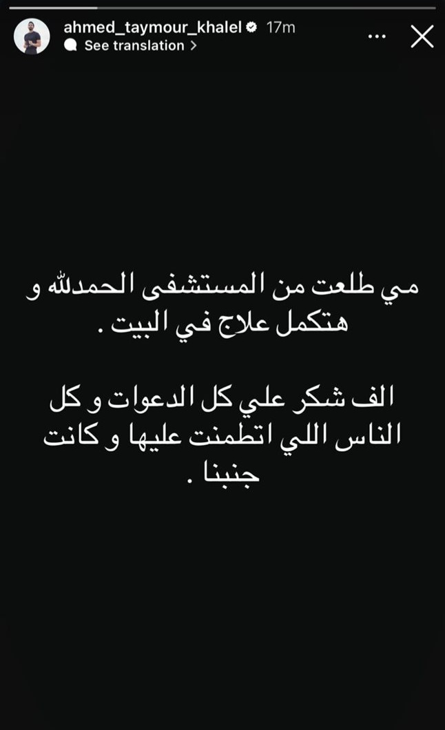 وكتب، في خاصية «الإستوري» بموقع الصور الشهير «انستجرام»: «مي طلعت من المستشفى الحمد لله وهتكمل علاج في البيت.. ألف شكر على كل الدعوات وكل الناس اللي اطمنت عليها وكانت جنبنا».