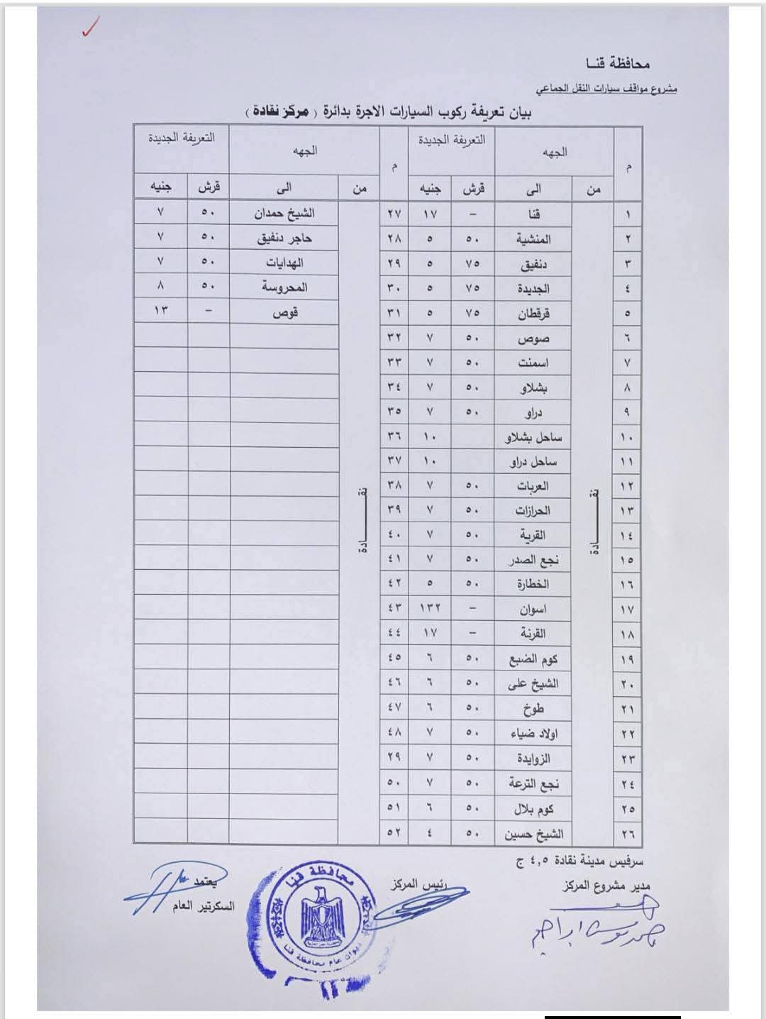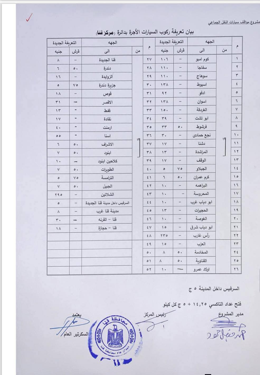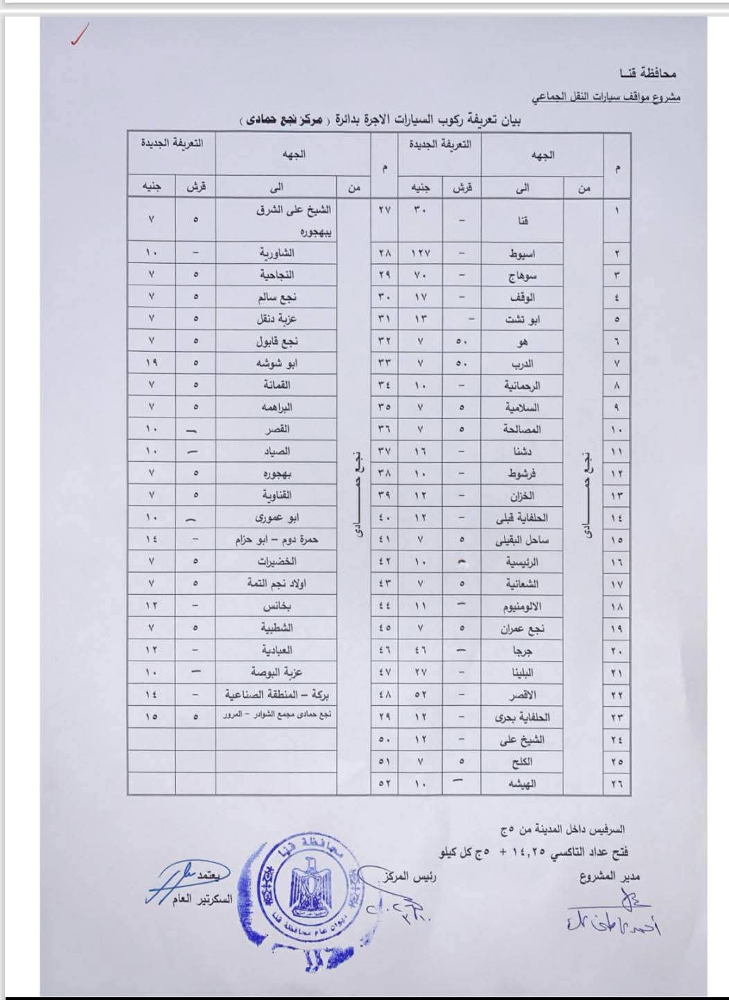 محافظ قنا يعتمد تعريفة