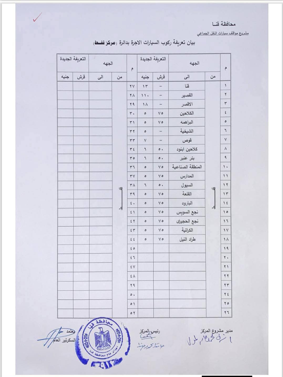 اعتمد اللواء دكتور مصطفى الببلاوي، محافظ قنا، تعريفة الركوب الجديدة للمواصلات العامة والخطوط الداخلية والخارجية بنطاق المحافظة، وتشمل سيارات الميكروباص والسرفيس وسيارات التاكسي، وذلك عقب تحريك سعر المواد البترولية بمعرفة لجنة التسعير التلقائي للمواد البترولية.