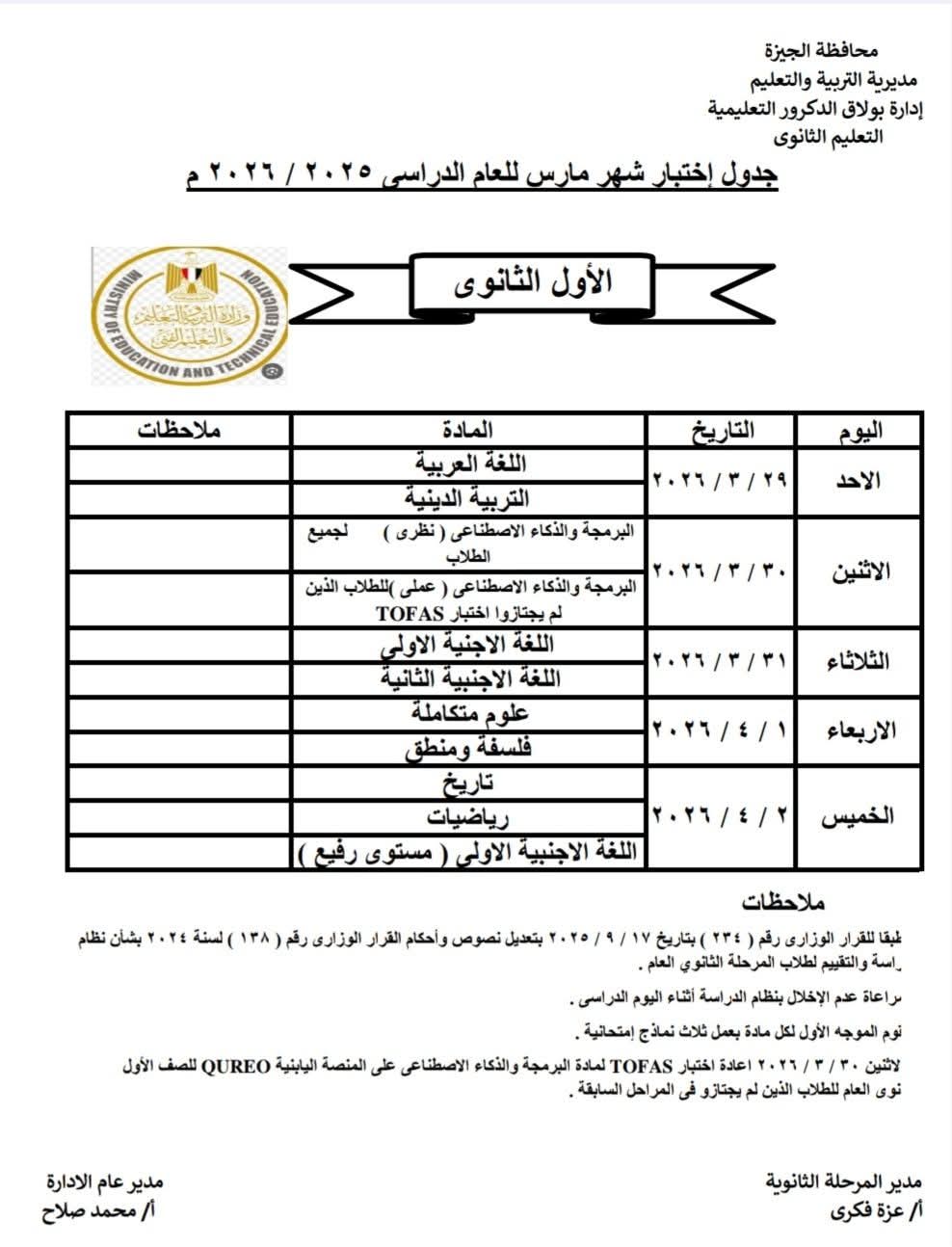 جدول اختبار شهر مارس الصف الأول الثانوي الجيزة