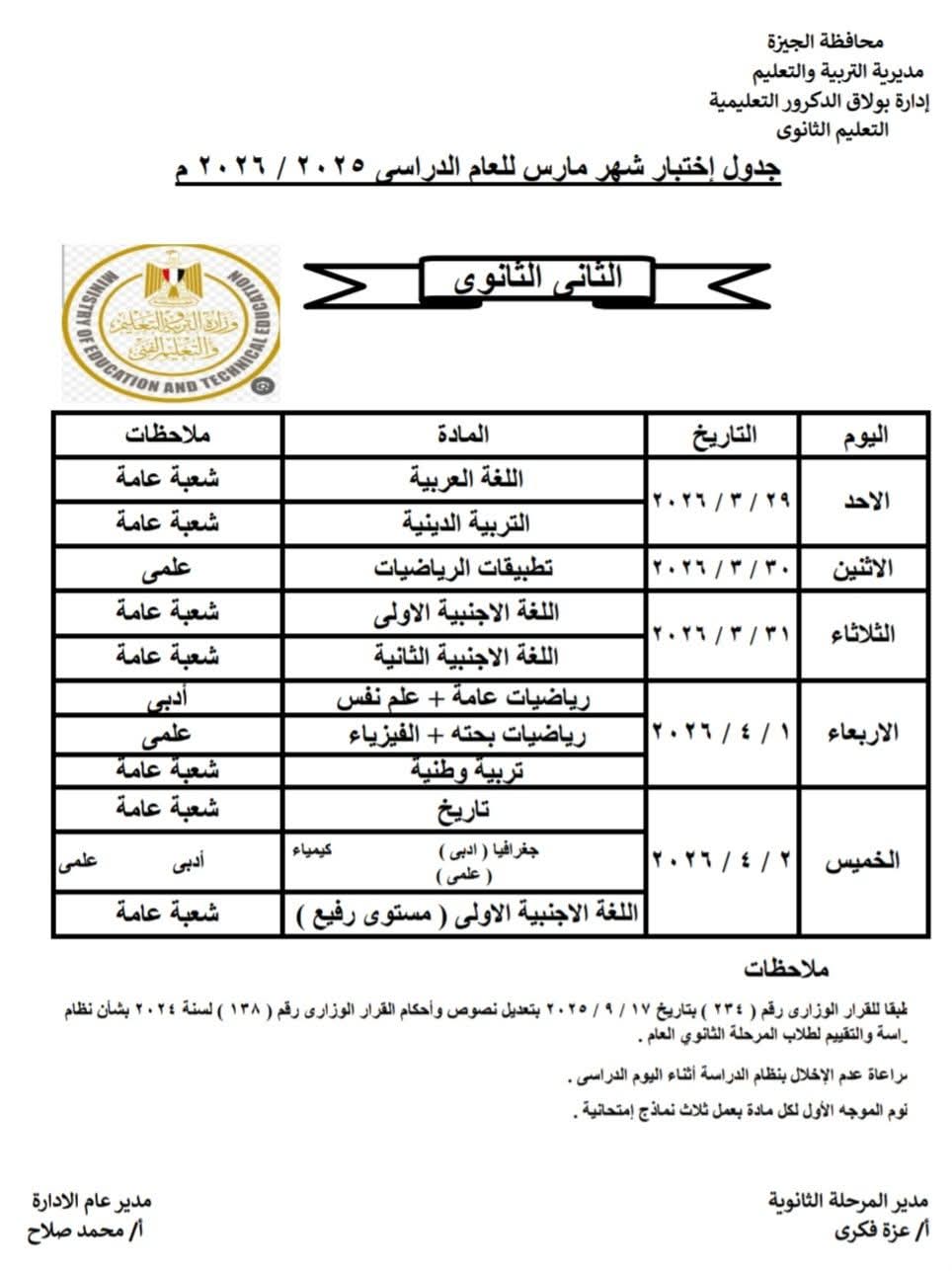 جدول وضوابط اختبار شهر مارس للصف الثانى الثانوى "الجيزة"
