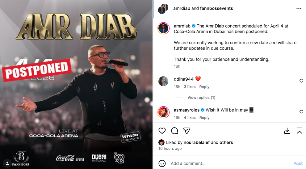 كما نشرت الصفحة الملصق الدعائي للحفل، وعلّقت قائلة: "حفل عمرو دياب الذي كان مقررًا إقامته يوم 4 أبريل على مسرح كوكاكولا أرينا في دبي تم تأجيله".