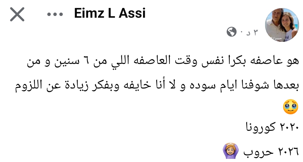 وكتبت إيمان العاصي، عبر حسابها الشخصي بموقع التواصل الاجتماعي فيسبوك: “هو عاصفه بكرة نفس وقت العاصفه اللي من 6 سنين ومن بعدها شوفنا أيام سودة ولا أنا خايفه وبفكر زيادة عن اللزوم، 2020 كورونا، 2026 حروب”.