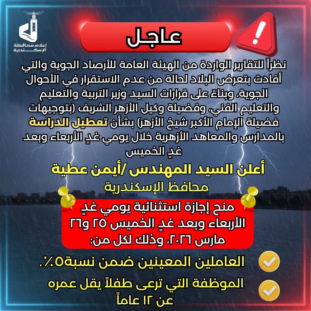 أعلنت محافظة الإسكندرية، بالتنسيق مع وزارة التربية والتعليم والتعليم الفني وفضيلة وكيل الأزهر الشريف، تعطيل الدراسة في المدارس والمعاهد الأزهرية يومي الأربعاء والخميس 25 و26 مارس 2026، نظرًا لتعرض البلاد لحالة من عدم الاستقرار في الأحوال الجوية، وفق ما أفادت به الهيئة العامة للأرصاد الجوية.