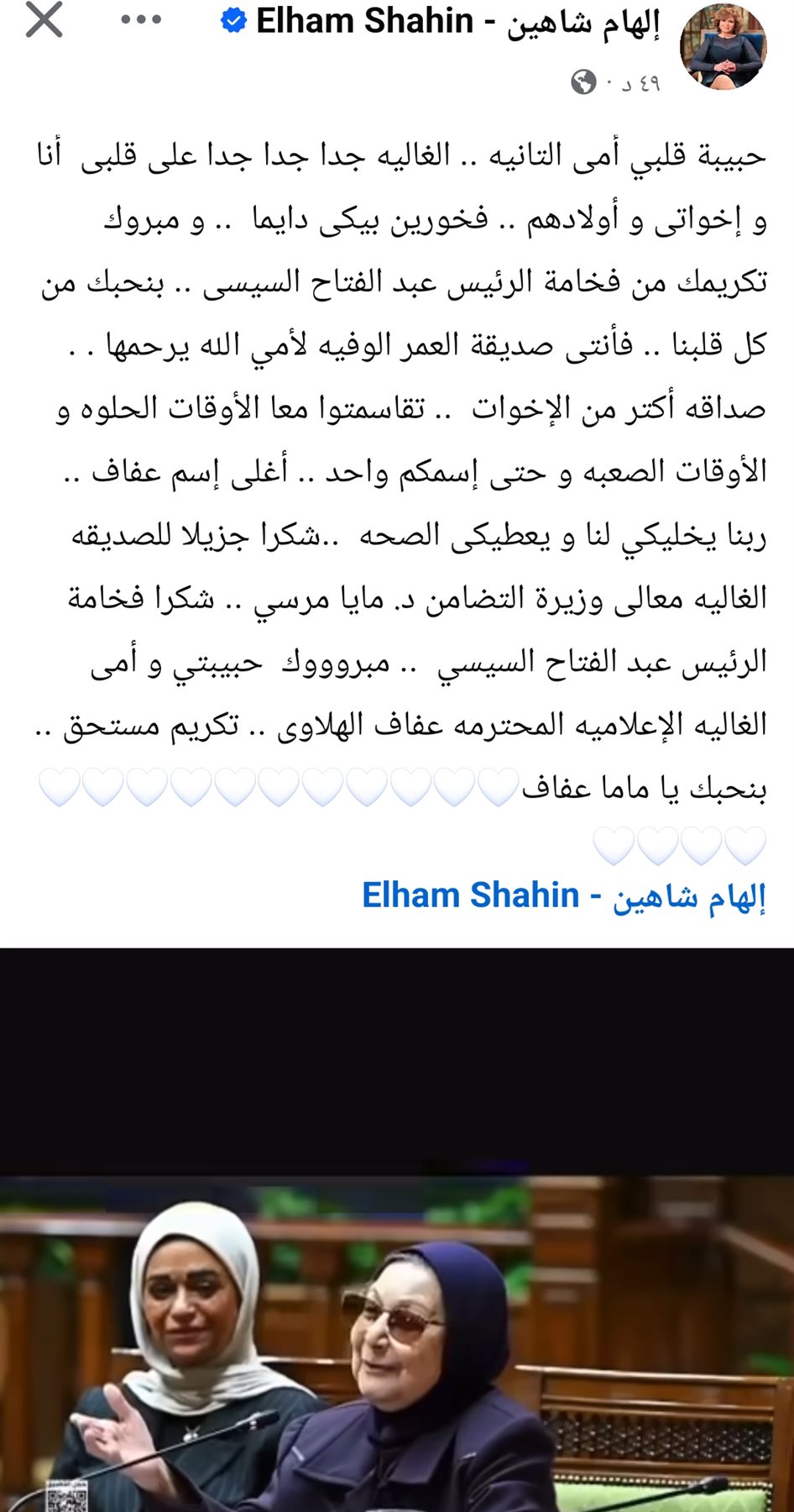 وعلقت قائلة: 'حبيبة قلبي أمى التانيه.. الغالية جدا جدا جدا على قلبى أنا وإخواتى وأولادهم.. فخورين بيكى دايما.. ومبروك تكريمك من فخامة الرئيس عبد الفتاح السيسى، بنحبك من كل قلبنا.. فأنتى صديقة العمر الوفيه لأمي الله يرحمها.. صداقه أكتر من الإخوات.. تقاسمتوا معا الأوقات الحلوة والأوقات الصعبة وحتى إسمكم واحد.. أغلى إسم عفاف".