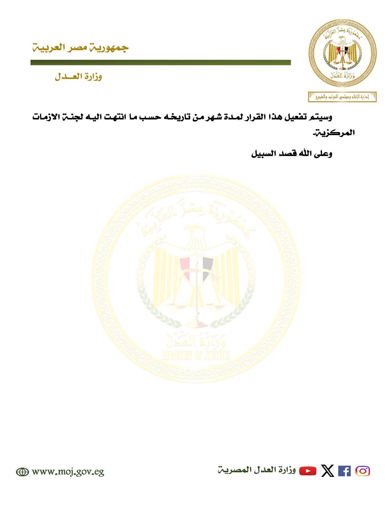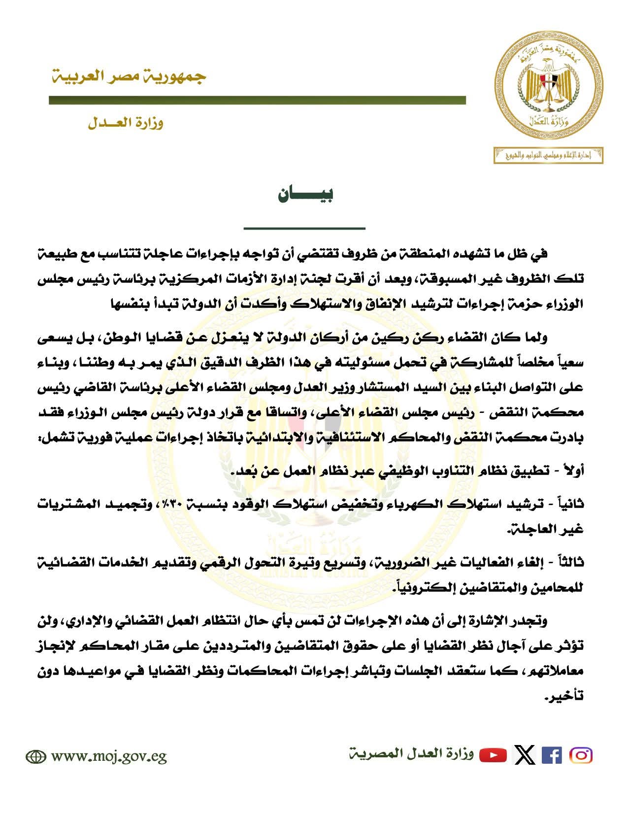 أوضحت الوزارة، في بيان رسمي، أن محكمة النقض والمحاكم الاستئنافية والابتدائية بدأت بالفعل في تطبيق عدد من الإجراءات الفورية، من بينها: