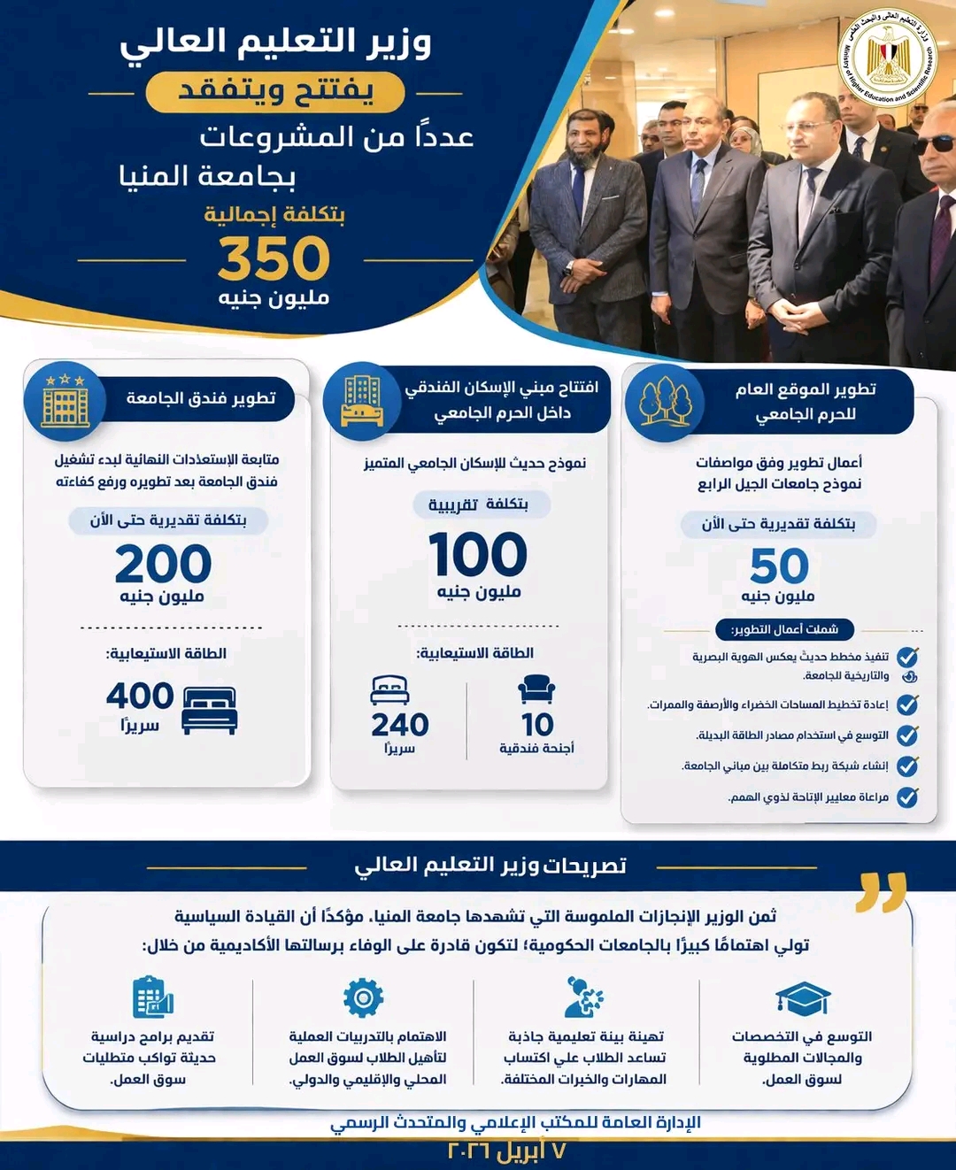 بتكلفة 350 مليون جنيه.. وزير التعليم العالي يفتتح مشروعات بجامعة المنيا «إنفوجراف»