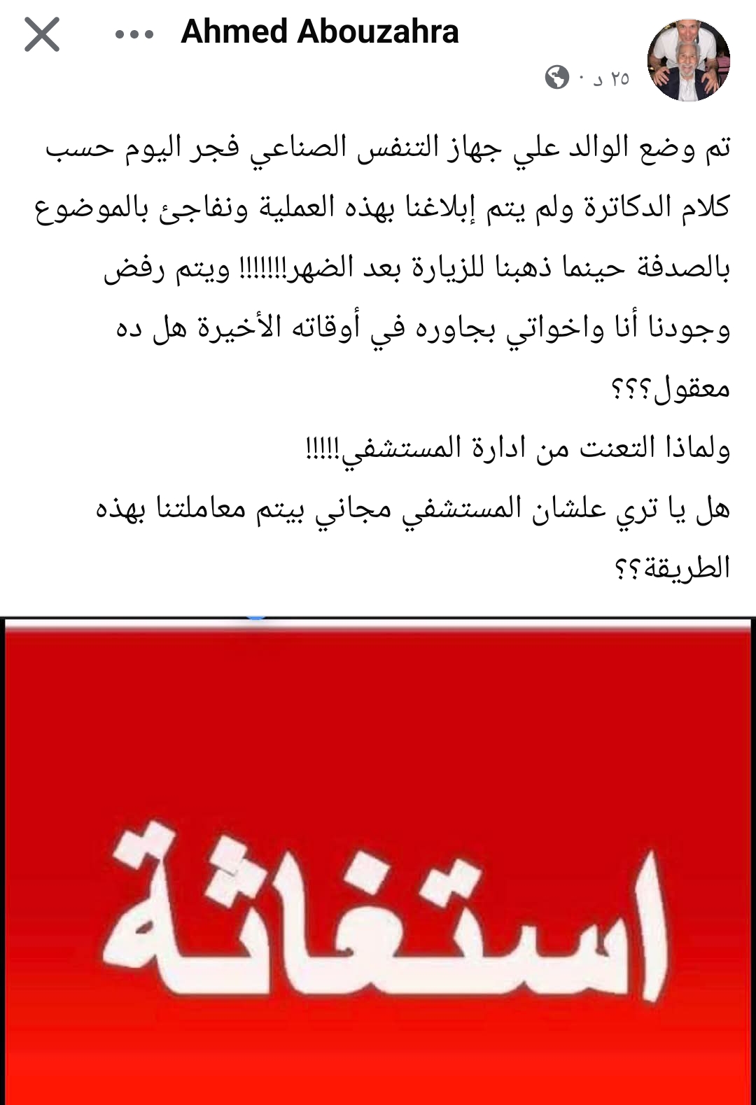 وأضاف: "يتم رفض وجودنا أنا وأخواتي بجاوره في أوقاته الأخيرة هل ده معقول؟؟؟، ولماذا التعنت من إدارة المستشفي!!!!!، هل يا ترى علشان المستشفي مجاني بيتم معاملتنا بهذه الطريقة؟؟".