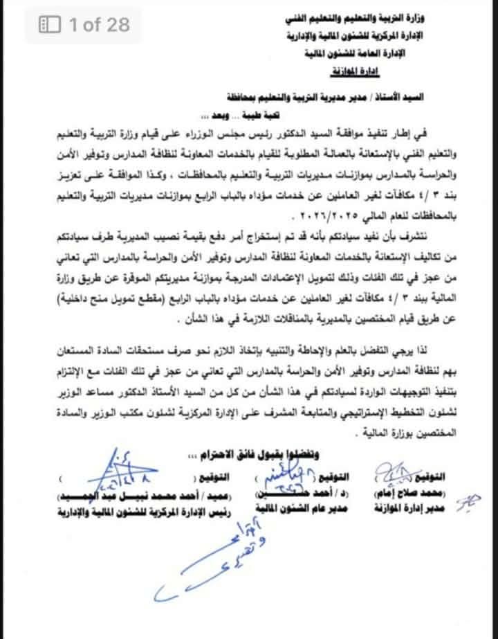 ووجّهت الإدارة المركزية للشئون المالية والإدارية، ممثلة في الإدارة العامة للشئون المالية، خطابًا رسميًا إلى المديريات التعليمية، أكدت خلاله على تعزيز بند (3/4) "مكافآت لغير العاملين عن خدمات مؤداه" بالباب الرابع، ضمن موازنة العام المالي 2025/2026.