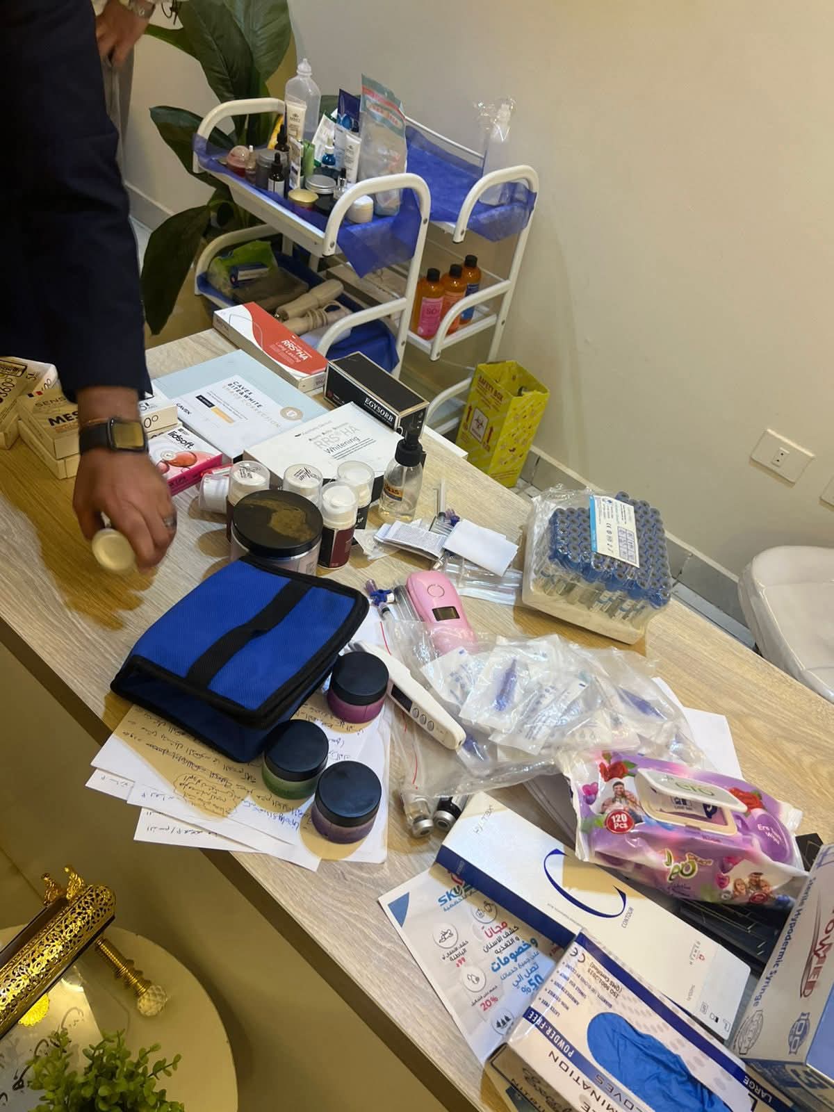 وأضاف أن العيادة كانت تعمل دون ترخيص مخالفةً لقانون تنظيم المنشآت الطبية رقم 53 لسنة 2004، كما تم ضبط كميات كبيرة من الأدوية ومستحضرات التجميل غير المسجلة، بالإضافة إلى عدم وجود عقد لتداول النفايات الخطرة، وقصور حاد في سياسات مكافحة العدوى، مما يشكل خطرًا مباشرًا على الصحة العامة.
