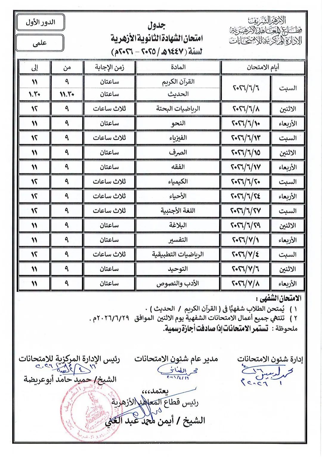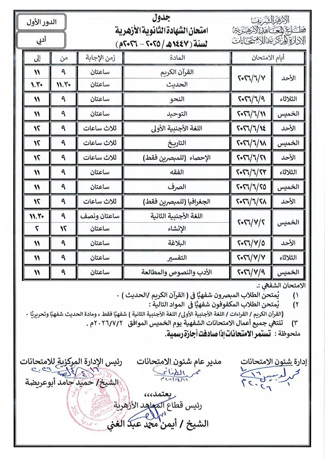 قطاع المعاهد الأزهرية جداول الشهادة الثانوية القسمين الأدبي
