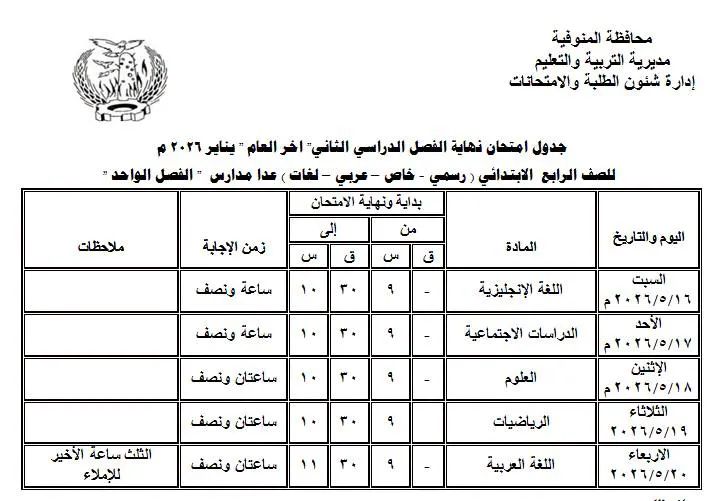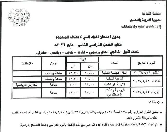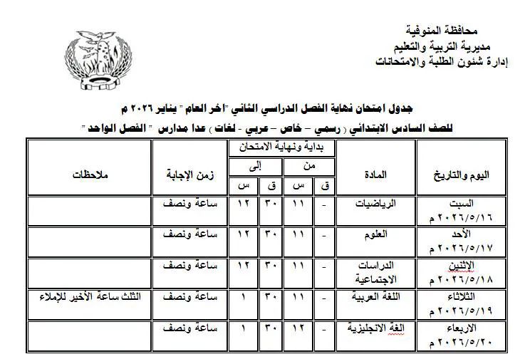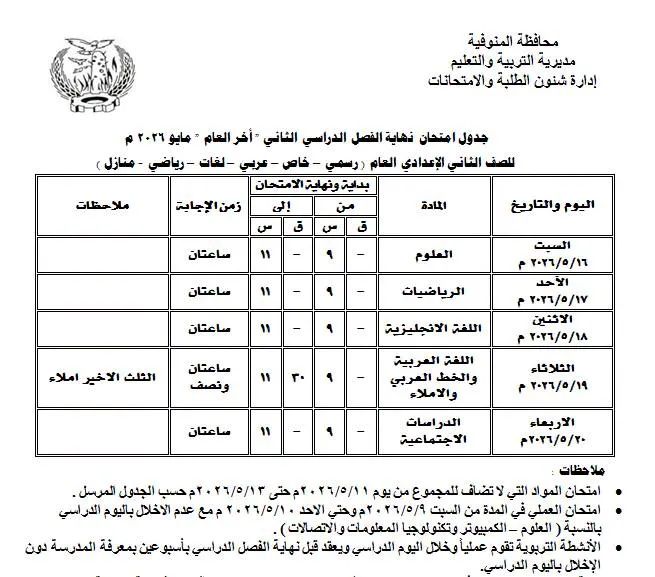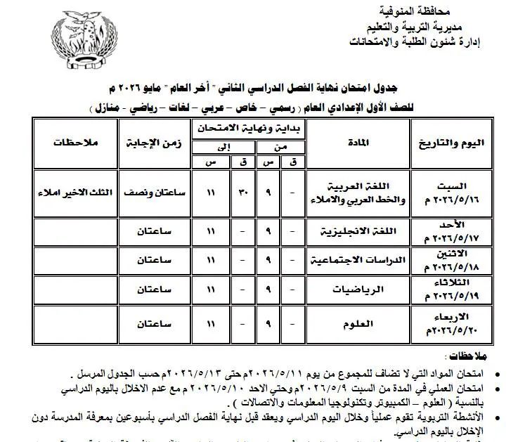 جداول امتحانات الترم الثاني لصفوف النقل والشهادة الإعدادية بالمنوفية بعد اعتمادها رسميًا