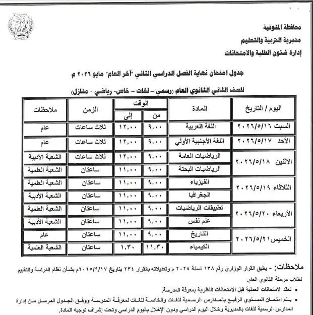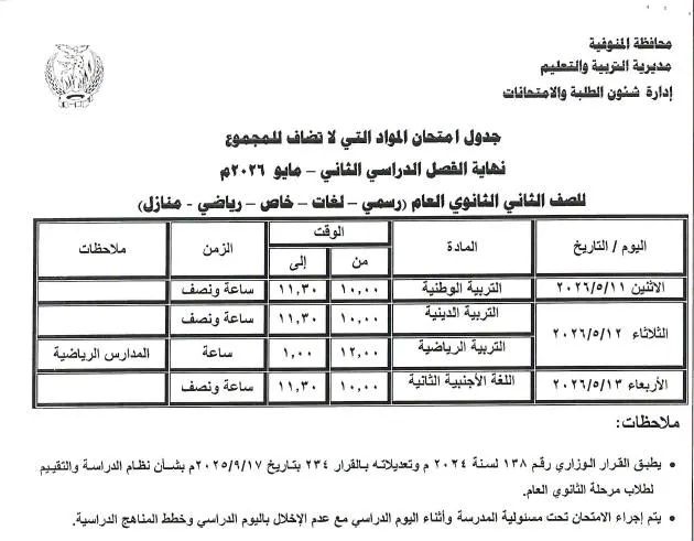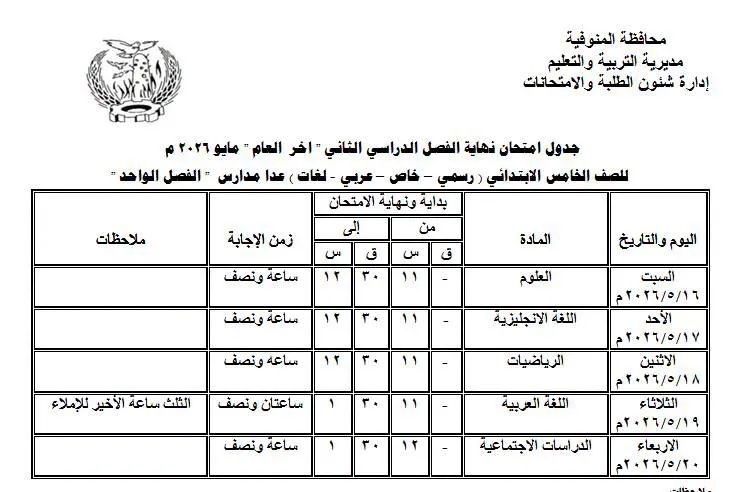 اعتمد اللواء عمرو الغريب، محافظ المنوفية، جداول امتحانات نهاية الفصل الدراسي الثاني "دور مايو" للعام الدراسي 2025/2026، لكافة صفوف المراحل التعليمية بمختلف الإدارات التعليمية على مستوى المحافظة، وذلك بحضور هاني عنتر مدير مديرية التربية والتعليم المنوفية.