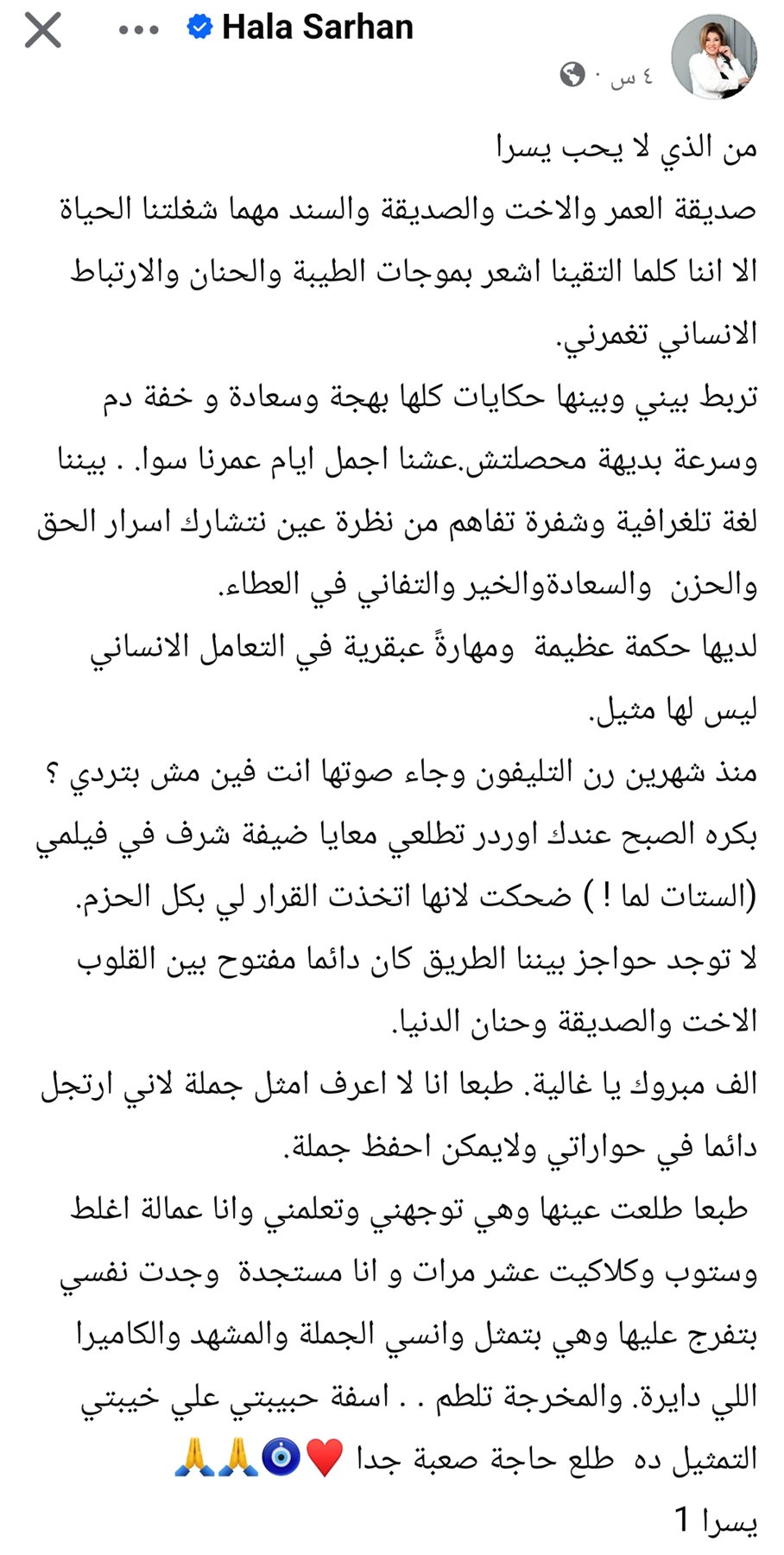 ونشرت هالة سرحان، صورة تجمعها بصديقتها يسرا، عبر حسابها الشخصي بموقع التواصل الاجتماعي فيسبوك، وعلقت قائلة: "صديقة العمر والأخت والصديقة والسند مهما شغلتنا الحياة إلا إننا كلما التقينا أشعر بموجات الطيبة والحنان والارتباط الإنساني تغمرني”.