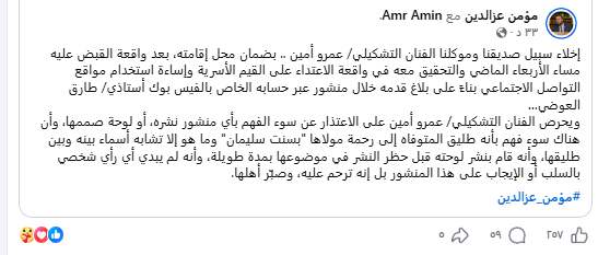 وفي أول تعليق من المحامي مؤمن عز الدين دفاع رسام الكاريكاتير، أكد أنه تم إخلاء سبيل موكله الفنان التشكيلي عمرو أمين، بضمان محل إقامته، بعد واقعة القبض عليه مساء الأربعاء الماضي والتحقيق معه في واقعة الاعتداء على القيم الأسرية وإساءة استخدام مواقع التواصل الاجتماعي بناءً على بلاغ قدمه المحامي طارق العوضي خلال منشور عبر حسابه الخاص بالفيسبوك.