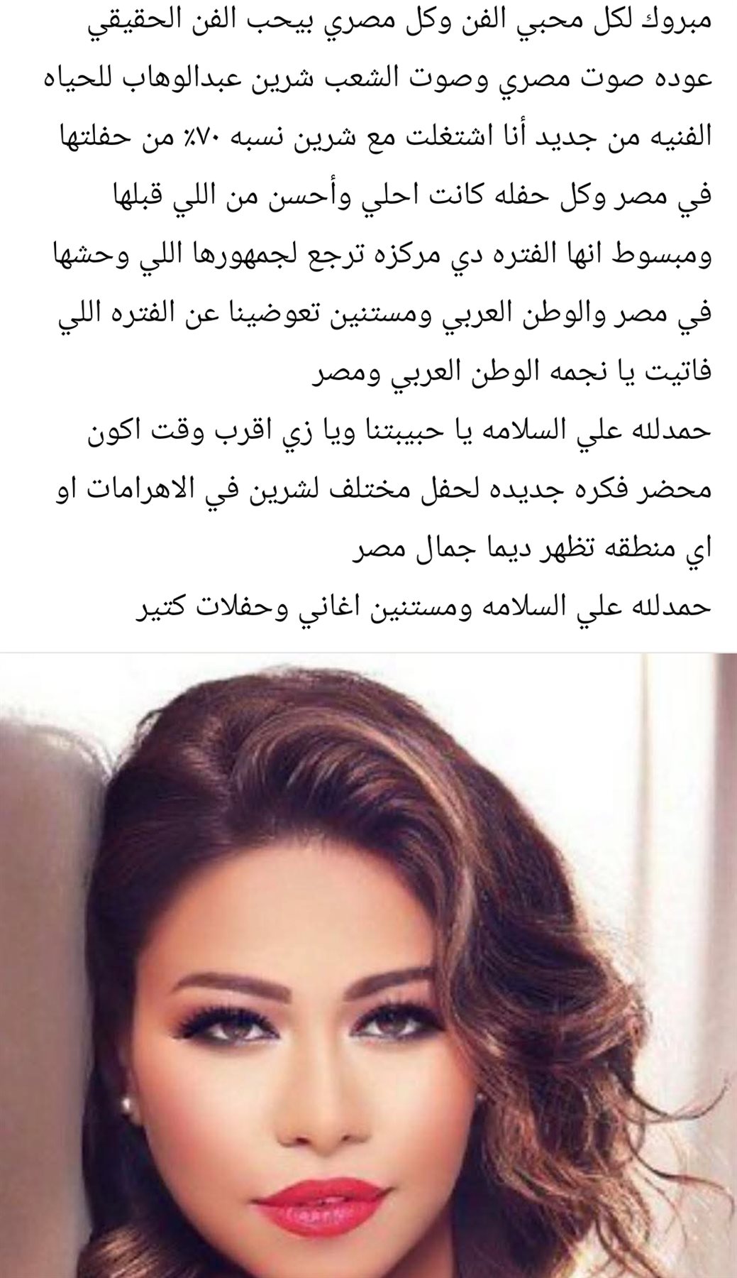 واختتم وليد منصور، قائلا: “حمدلله على السلامة يا حبيبتنا ويارب أقرب وقت أكون محضر فكرة جديدة لحفل مختلف لشيرين في الأهرامات أو أي منطقه تظهر ديما جمال مصر، حمدلله على السلامة ومستنين أغاني وحفلات كتير”.