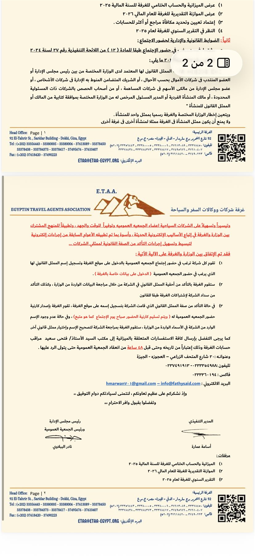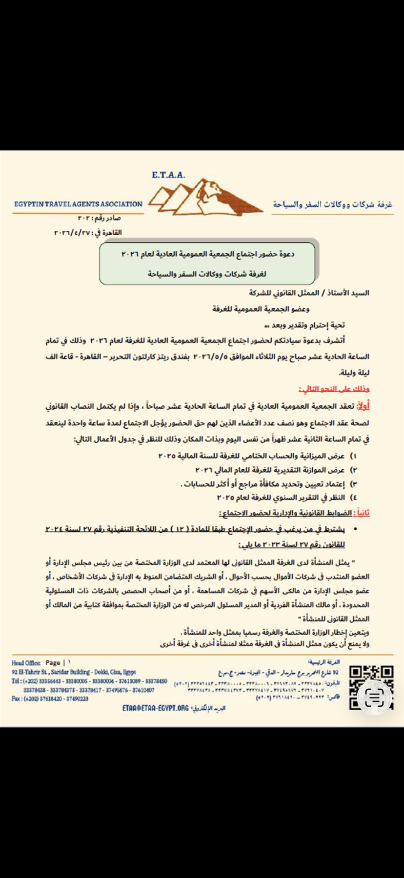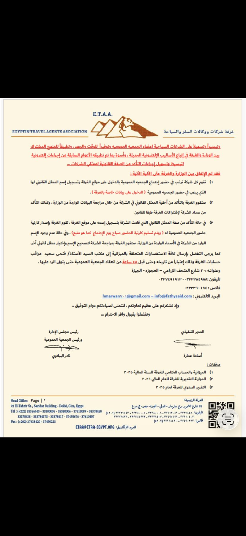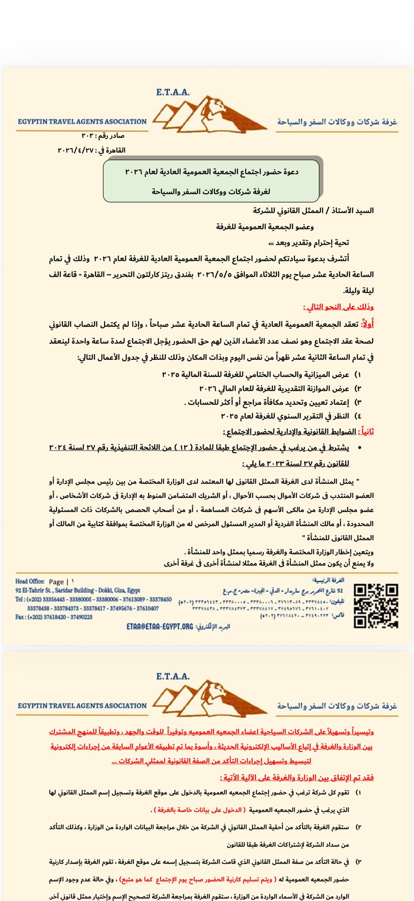 وتيسيرًا وتسهيلًا على الشركات السياحية أعضاء الجمعية العمومية وتوفيرًا  للوقت والجهد، وتطبيقًا للمنهج المشترك بين الوزارة والغرفة في إتباع الأساليب الإلكترونية الحديثة، فقد تم الإتفاق بينهما على إنهاء اجراءات الحضور الكترونيا من خلال موقع الغرفة وبالية محددة تضمنتها الدعوة للجمعية العمومية التي وجهتها الغرفة للشركات والتي تضمنت مكان انعقاد الجمعية  بفندق ريتز كارلتون التحرير.