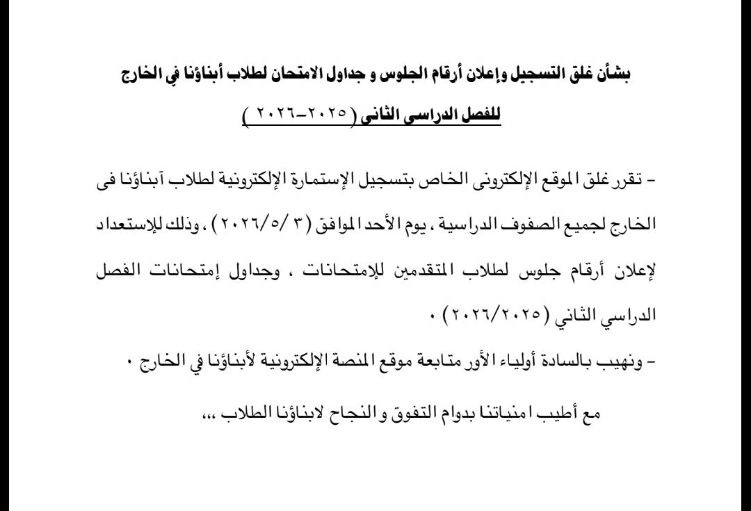 أعلنت وزارة التربية والتعليم والتعليم الفني عن إغلاق باب التسجيل الإلكتروني الخاص بطلاب نظام أبناؤنا في الخارج لجميع الصفوف الدراسية، وذلك يوم الأحد الموافق 3 مايو 2026، في إطار الاستعداد لإعلان أرقام الجلوس وجداول امتحانات الفصل الدراسي الثاني للعام الدراسي 2025-2026.
