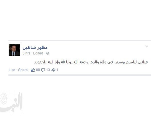 "مظهر شاهين" يعزي باسم يوسف عبر الـ"فيس بوك" تاريخ النشر | السبت 23/مايو/2015 - 06:26 م 5/23/2015 6:26:39 PM مظهر شاهين شارك يذكر أن الإعلامي باسم يوسف، قد أعلن عبر حسابه اليوم على موقع التواصل الاجتماعي "تويتر" عن وفاة والده المستشار رأفت يوسف في حادث سيارة . شارك