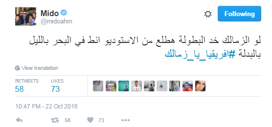 أكد أحمد حسام "ميدو"، المدير الفنى السابق لفريق الزمالك، ومحلل قنوات "بى إن سبورت" فى تغريدة له عبر موقع التواصل الاجتماعي "تويتر" أنه سيقفز فى البحر بالبدلة فى حالة فوز الزمالك في المباراة النهائية ببطولة إفريقيا للأندية الأبطال على حساب "صن داونز" بطل جنوب إفريقيا والمقرر لها مساء غد، الأحد.