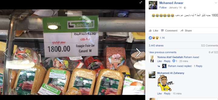 تداول عدد من نشطاء موقع التواصل الاجتماعي "فيس بوك"، صورة لوصول سعر كيلو "كبد البط"، إلى 1800 جنيه في إحدي السلاسل التجارية الكبرى، مما آثار عددًا من الانتقادات والسخرية حول هذا السعر.