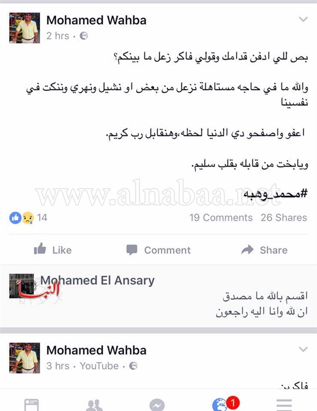 وكتب «وهبة» عبر صفحته الخاصة على موقع التواصل الاجتماعي «فيسبوك»: «بص للي دفن قدامك وقولي فاكر زعل مابينكم؟.. والله ما في حاجة مستاهلة نزعل من بعض أو نشيل ونهري وننكت في نفسينا، اعفوا واصفحوا، دي الدنيا لحظة، وهناقبل رب كريم، ويا بخت من قابله بقلب سليم».