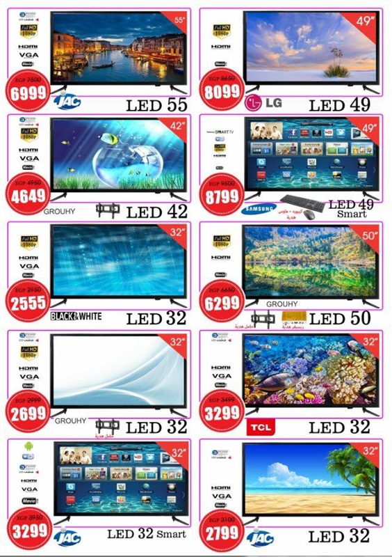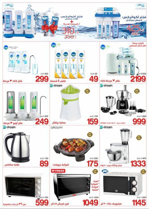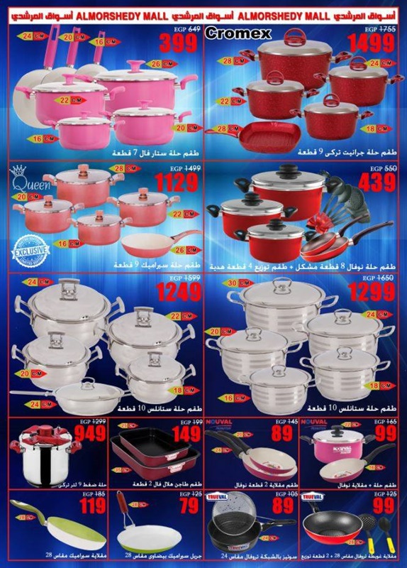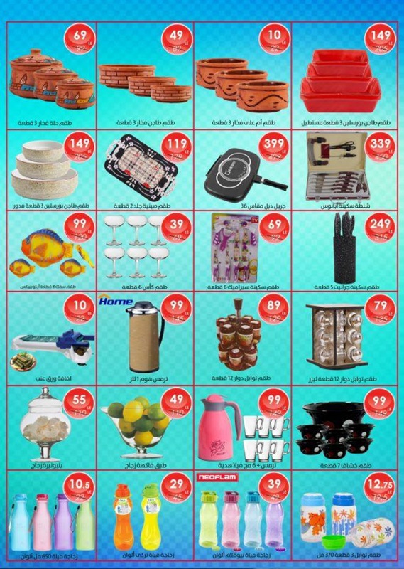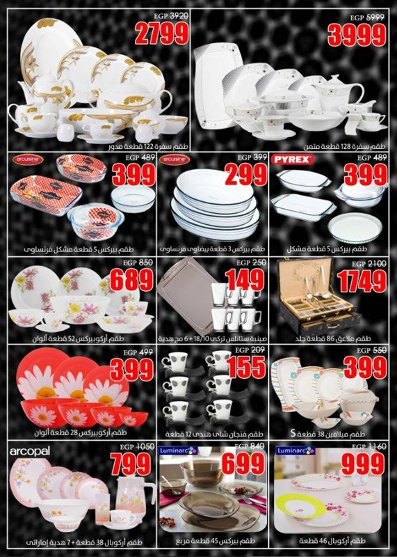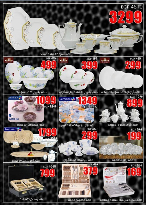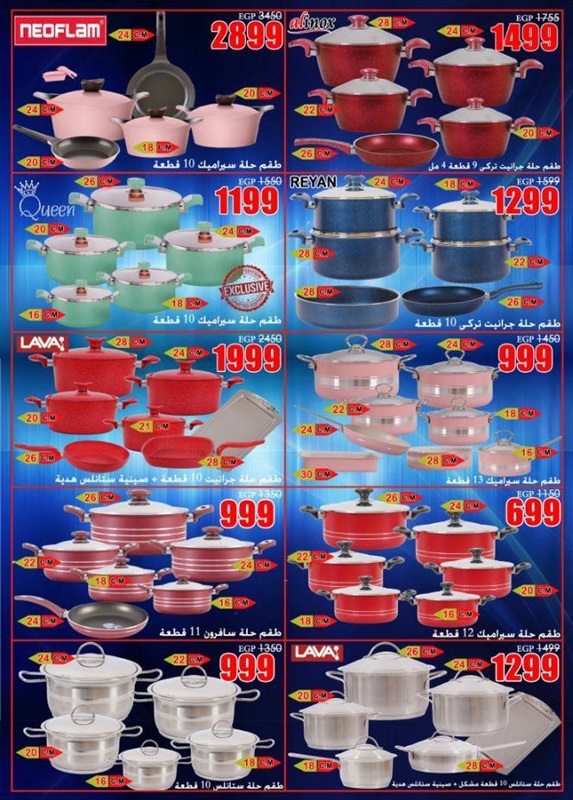وضمت عروض الأدوات المنزلية على الآتي: "طقم حلة سراميك 12 قطعة بسعر 999 جنيهًا، وظقم حلة جرانيت 10 قطع بسعر 1999 جنيهًا، وطقم حلة ستانلس 10 قطعة بسعر 999 جنيهًا".