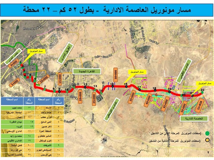 وأوضح أن السعة التصميمية للمونوريل 48 ألف راكب / الساعة / الاتجاه، ويبلغ زمن الرحلة 35 دقيقة، وزمن التقاطر 90 ثانية، وعدد القطارات 27 قطاراً، وعدد عربات المرحلة الأولى 108 عربات تسع 24 ألف راكب / الساعة / الاتجاه، بسرعة 80 كم/الساعة، ويصل الجدول الزمنى للمشروع 3 سنوات، وحجم الركاب عند بدء التشغيل عام 2020، ربع مليون راكب يومياً، وسيخلق المشروع فرص عمالة فنية، وستشارك مصر في إنشاء خط تصنيع وتجميع قطارات المونوريل.