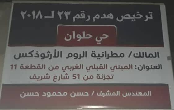 وقدّم أحد أفراد الطائفة شكوى وبلاغ، تبين أنه صدر ترخيص هدم رقم 23 لسنة 2018، بالمخالفة لقانون تنظيم أعمال بناء وترميم الكنائس وملحقاتها، الذى يقر فى المادة «7» الآتى: «لا يجوز تغيير الغرض من الكنيسة المرخصة أو ملحق الكنيسة المرخص إلى أى غرض أخر، ولو توقفت إقامة الصلاة والشعائر الدينية بها، ويقع باطلا كل تصرف على خلاف ذلك».