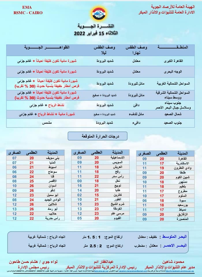 كشفت هيئة الأرصاد الجوية، توقعاتها بشأن حالة الطقس، غدًا، الثلاثاء 15- 2- 2022.