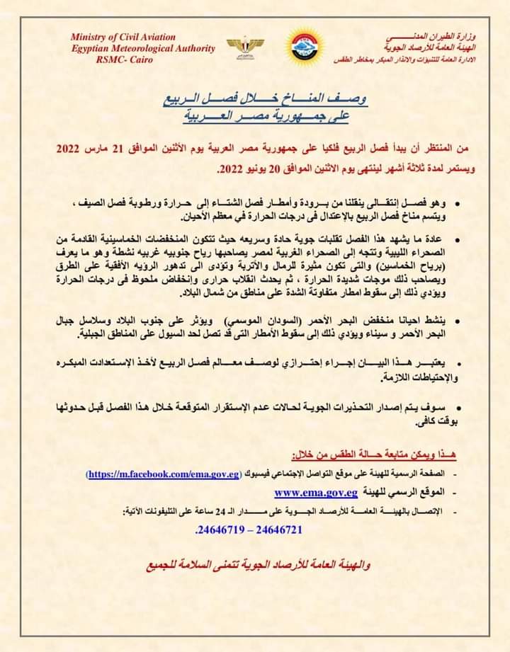 ولفتت  هيئة الأرصاد الجوية، إلى أن ذلك البيان احترازي لوصف معالم فصل الربيع لأخذ الاستعدادات المبكرة والاحتياطات اللازمة، مؤكدة أنه سوف يتم إصدار التحذيرات الجوية لحالات عدم الاستقرار المتوقعة خلال هذا الفصل قبل حدوثها بوقت كاف.