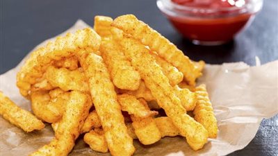 يوضع القليل من الزيت على النار وتُحمر البطاطس حتى يصبح لونها ذهبيًا، ثم تُرفع وتُصفى جيدًا من الزيت.